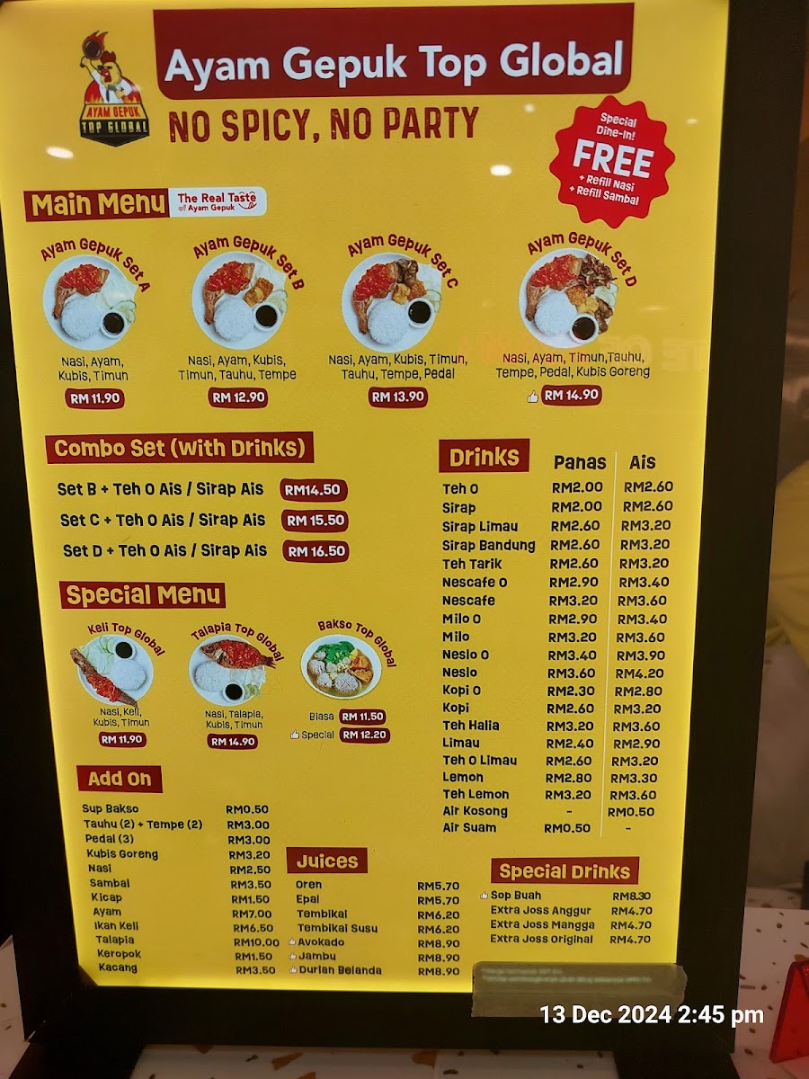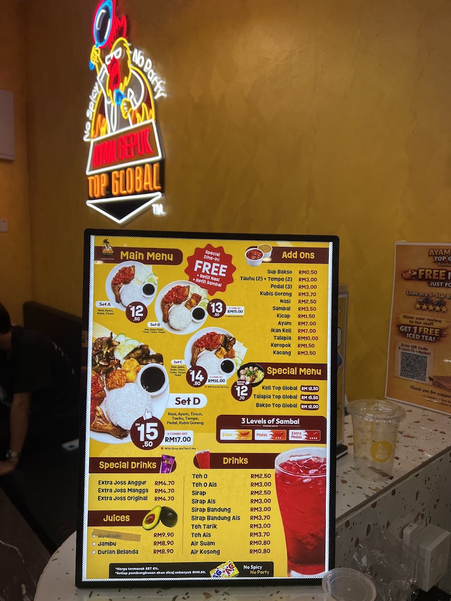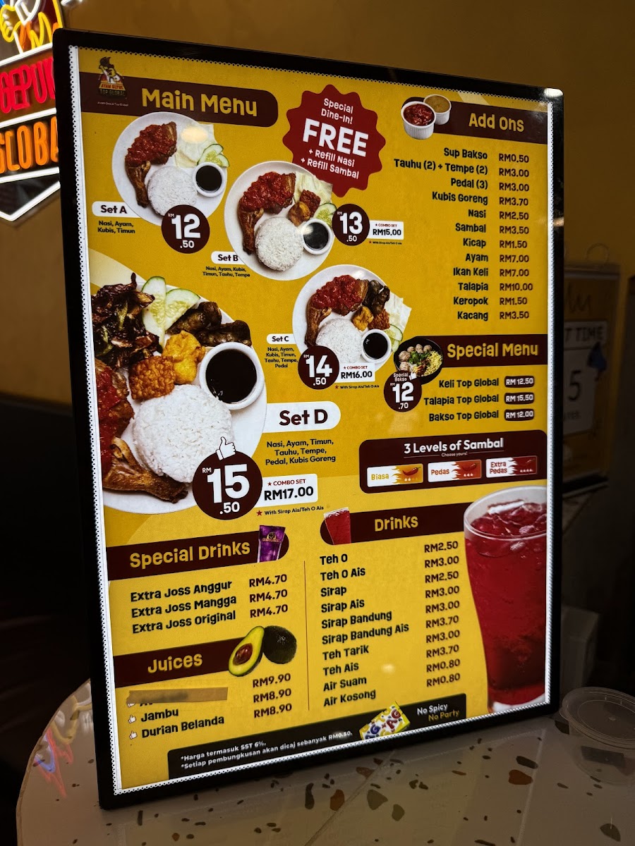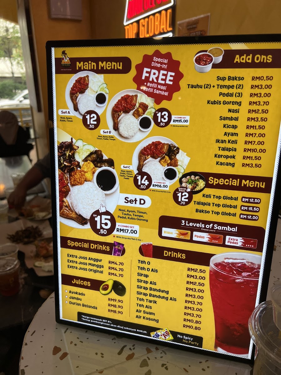 Ayam Gepuk Top Global • Kinrara is a standout Indonesian restaurant located in Bandar Kinrara, Puchong, celebrated for its signature dish—succulent, marinated chicken grilled to perfection and smothered in a vibrant, spicy sambal. The ayam gepuk here boasts a crispy exterior with juicy, tender meat inside, offering a bold, balanced flavor that excites the palate without overwhelming it. Customers often praise the generous portions and the freshness of the ingredients, especially the fragrant rice paired with fresh vegetables and rich, savory sauces.
